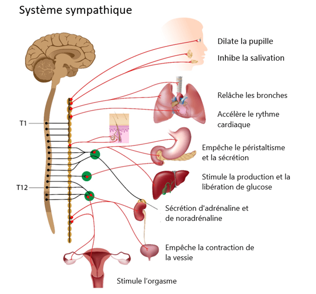 Le système nerveux sympathique est l’une des trois branches du système nerveux autonome. Le système nerveux autonome, comme son nom l’indique, régule automatiquement les processus physiologiques involontaires, comme par exemple, le rythme cardiaque, la pression sanguine, la respiration et la digestion. Même si une personne peut accélérer ou réduire l’activité normale de ces processus, le système nerveux autonome les active et les maintient. Par exemple, le cœur bat, les poumons respirent et l’estomac digère sans qu’on y pense.