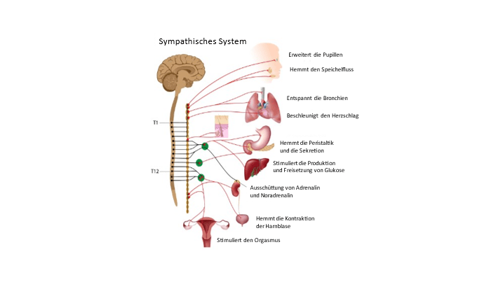 In der Abbildung unten sehen Sie, wo die Sympathikusnerven liegen und welche Organe sie steuern. Die Pupillen der Augen weiten sich, so dass mehr Licht in das Auge eindringt und die Sicht verbessert wird. Die Bronchien der Lunge entspannen und weiten sich, wodurch sich der Luftstrom und die Atemfrequenz erhöhen. Der Schrittmacher des Herzens erhöht die Herzfrequenz und schickt mehr Blut zu den Muskeln. Diese und andere physiologische Veränderungen ermöglichen es dem Körper, auf eine ängstliche oder gefährliche Situation zu reagieren.