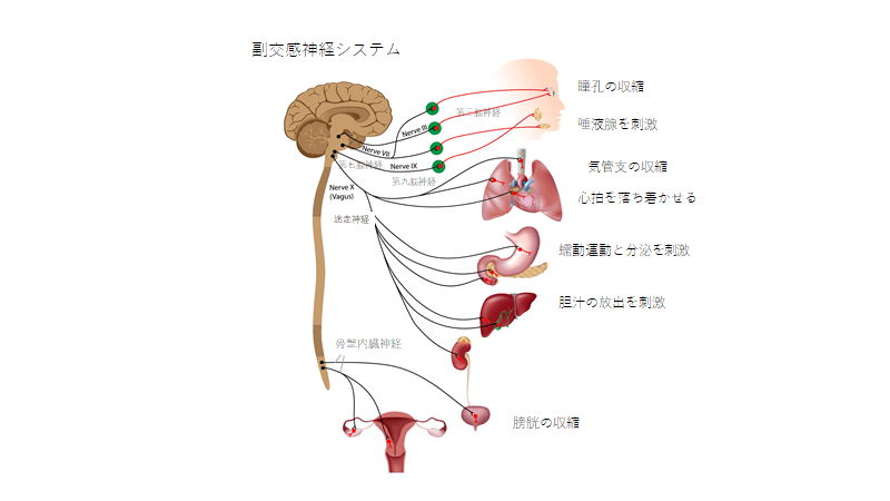 下の図を見てください。人はリラックスすると、呼吸数や心拍数が通常の安静時のペースに戻ります。唾液腺が刺激され、唾液が分泌されます。消化腺が刺激され、酵素、胆汁、酸が分泌されます。消化管を覆う筋肉に、波のような煽情運動が起き、食物を移動させます。