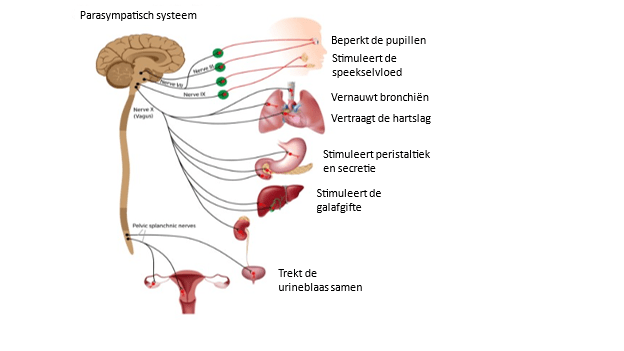 Kijk eens naar het onderstaande diagram. Het parasympatisch zenuwstelsel wordt vaak aangeduid als “rust en spijsvertering”. Wanneer een persoon ontspannen is, worden zijn ademhaling en hartslag teruggebracht naar het normale rusttempo.