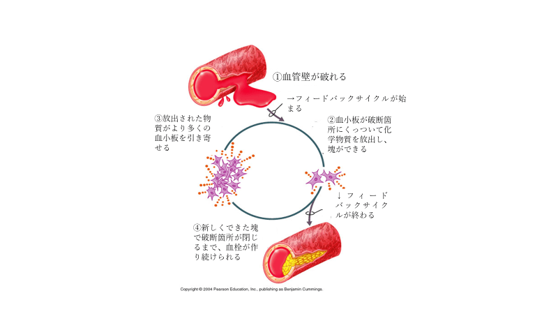 正のフィードバック・ループで生み出される最終生成物は、化学経路を止める訳ではなく、むしろ、化学経路をオンのままにしておき、最終結果を引き起こします。正のフィードバック・ループの一例として、止血が挙げられます。このメカニズムは、血管からの出血を止めます。下図を参照しながら、止血の説明を読んでください。