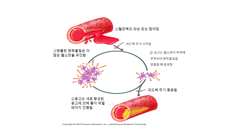 긍정적인 피드백 루프의 최종 생성물은 화학적 경로를 끄지 않습니다. 대신 생산되는 제품은 최종 결과를 생성하기 위해 화학적 경로를 활성화 상태로 유지합니다. 긍정적인 피드백 루프의 한 예는 지혈입니다. 이 메커니즘으로 인해 혈관에서 출혈을 멈추게 합니다. 지혈에 대한 설명을 읽을 때 아래 그림을 참조하십시오.