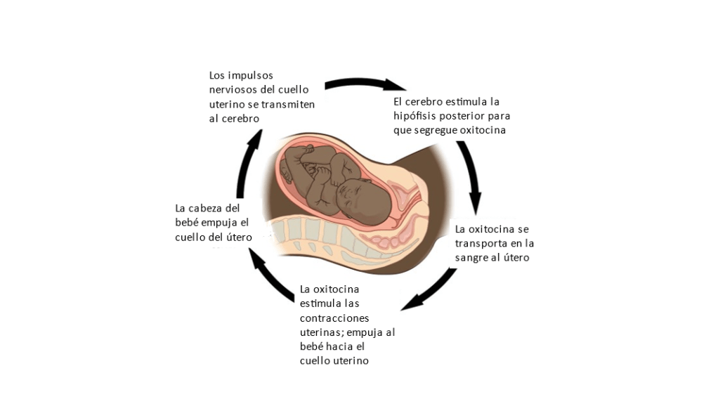 Otro ejemplo de circuito de retroalimentación positiva es el parto. Cuando comienzan las contracciones uterinas, el cerebro estimula la glándula pituitaria para que segregue la hormona oxitocina. Cuando la cabeza del bebé empuja el cuello del útero, se transmiten impulsos nerviosos desde el cuello del útero al cerebro. La glándula pituitaria es estimulada para liberar más oxitocina. Este ciclo de retroalimentación positiva continúa hasta que nace el bebé y se expulsa la placenta.