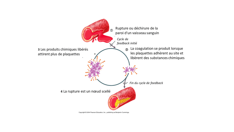 Lorsqu’une rupture ou une déchirure se produit dans la paroi d’un vaisseau sanguin, celui-ci se resserre immédiatement pour diminuer le flux sanguin. Des substances chimiques appelées facteurs de coagulation sont libérées pour attirer les plaquettes (représentées en violet) vers le site de la plaie. Cela déclenche le cycle de rétroaction positive. Lorsque la coagulation commence à se produire, les plaquettes libèrent également des substances chimiques pour attirer d’autres plaquettes. Les plaquettes se collent les unes aux autres et forment un bouchon plaquettaire. Les facteurs de coagulation stimulent également la production d’une protéine insoluble appelée fibrine. Comme son nom l’indique, la fibrine est disposée en longues chaînes fibreuses. Le caillot de fibrine (représenté en jaune) se renforce puis se dissout lorsque la paroi du vaisseau sanguin blessé se referme et guérit. La gravité d’une lésion de la paroi d’un vaisseau peut varier en fonction de sa localisation, de sa taille et de sa profondeur. Le saignement d’une artère qui transporte le sang pompé hors du cœur est plus abondant que celui d’une veine qui ramène le sang vers le cœur. La cycle de rétroaction positive responsable de l’hémostase se répète jusqu’à la formation du caillot.