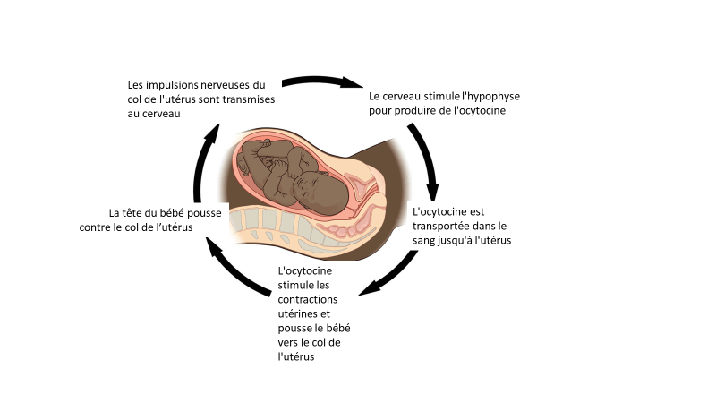 Un autre exemple de cycle de rétroaction positive est le travail pendant l’accouchement. Lorsque les contractions utérines commencent, le cerveau stimule l’hypophyse pour qu’elle sécrète l’hormone ocytocine. L’ocytocine est transportée dans la circulation sanguine jusqu’à l’utérus, ce qui entraîne une augmentation de la force et de la fréquence des contractions. Lorsque la tête du bébé pousse contre le col de l’utérus, des impulsions nerveuses sont transmises du col de l’utérus au cerveau. L’hypophyse est stimulée pour libérer davantage d’ocytocine. Ce cycle de rétroaction positive se poursuit jusqu’à ce que le bébé soit né et que le placenta soit expulsé.