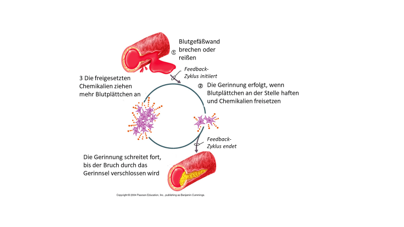 Wenn ein Bruch oder Riss in einer Blutgefäßwand auftritt, verengt sich das Gefäß sofort, um den Blutfluss zu verringern. Chemische Substanzen, so genannte Gerinnungsfaktoren, werden freigesetzt und locken Blutplättchen (lila dargestellt) an die Wundstelle. Dadurch wird der positive Rückkopplungszyklus in Gang gesetzt. Wenn die Gerinnung einsetzt, setzen die Blutplättchen ebenfalls Chemikalien frei, die weitere Blutplättchen anziehen. Die Blutplättchen kleben zusammen und bilden einen Plättchenpfropf. Die Gerinnungsfaktoren stimulieren auch die Produktion eines unlöslichen Proteins namens Fibrin. Wie sein Name schon sagt, ist Fibrin in langen Faserketten angeordnet. Das Fibringerinnsel (gelb dargestellt) verfestigt sich und löst sich dann auf, wenn sich die verletzten Blutgefäßwände schließen und heilen. Der Schweregrad einer verletzten Gefäßwand kann je nach Lage, Größe und Tiefe variieren. Blutungen aus einer Arterie, die das gepumpte Blut vom Herzen wegführt, sind stärker als Blutungen aus einer Vene, die das Blut zurück zum Herzen transportiert. Die positive Rückkopplungsschleife, die für die Blutstillung verantwortlich ist, wiederholt sich so lange, bis sich das Gerinnsel gebildet hat.