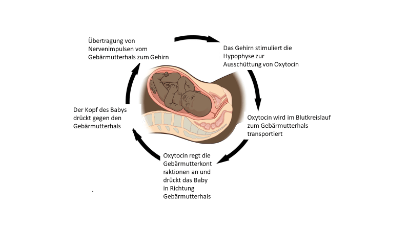 Ein weiteres Beispiel für eine positive Rückkopplungsschleife sind die Wehen während der Entbindung. Wenn die Gebärmutterkontraktionen beginnen, regt das Gehirn die Hypophyse an, das Hormon Oxytocin auszuschütten. Oxytocin wird über den Blutkreislauf in die Gebärmutter transportiert und bewirkt eine Zunahme der Stärke und Häufigkeit der Wehen. Wenn der Kopf des Babys gegen den Gebärmutterhals drückt, werden Nervenimpulse vom Gebärmutterhals an das Gehirn weitergeleitet. Die Hirnanhangsdrüse wird angeregt, mehr Oxytocin auszuschütten. Dieser positive Rückkopplungszyklus setzt sich fort, bis das Baby geboren und die Nachgeburt ausgestoßen ist.