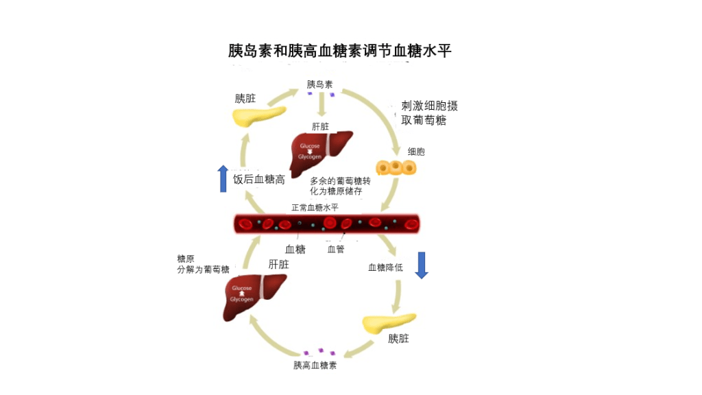 负反馈系统的第一个例子是血液中葡萄糖水平的调节。请参阅下图左中部。饭后,血液中的葡萄糖水平会升高。胰腺分泌激素胰岛素。胰岛素在血液中传播,刺激细胞吸收葡萄糖作为能量。任何多余的葡萄糖都会被运送到肝脏,在那里它被转化为糖原并储存起来。当血液中的葡萄糖水平低于正常水平时,胰腺会分泌激素胰高血糖素。胰高血糖素在血液中被运送到肝脏,导致储存的糖原分解成葡萄糖。葡萄糖进入血液,从而使血液中的葡萄糖水平恢复正常。