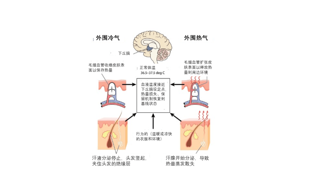 负反馈的第二个例子是调节体温。下丘脑是身体的恒温器。它包含一个热促进中心和一个愈合损失中心。请参阅下图的左侧。当身体外围寒冷时,皮肤中的感觉神经受体会向下丘脑发送信息。下丘脑的热促进中心激活神经系统以收缩皮肤表面附近的毛细血管。这减少了热量损失并保存了热量。神经系统会关闭对汗腺的刺激。毛囊中竖立肌的收缩会导致皮肤毛发竖起,从而吸收热量。神经系统还激活骨骼肌活动,导致颤抖,从而产生热量。