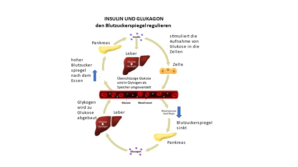 Das erste Beispiel für ein negatives Rückkopplungssystem ist die Regulierung des Glukosespiegels im Blut. Sehen Sie sich den linken mittleren Teil der Abbildung unten an. Nach dem Verzehr einer Mahlzeit steigt der Glukosespiegel im Blut an. Die Bauchspeicheldrüse schüttet das Hormon Insulin aus. Das Insulin wandert durch das Blut und regt die Zellen zur Aufnahme von Glukose an, die sie als Energie nutzen. Überschüssige Glukose wird in die Leber transportiert, wo sie in Glykogen umgewandelt und gespeichert wird. Wenn der Glukosespiegel im Blut unter den normalen Wert sinkt, schüttet die Bauchspeicheldrüse das Hormon Glukagon aus. Glukagon wird mit dem Blut zur Leber transportiert und bewirkt, dass das gespeicherte Glykogen in Glukose abgebaut wird. Die Glukose gelangt ins Blut und bringt den Glukosespiegel im Blut wieder auf den Normalwert.