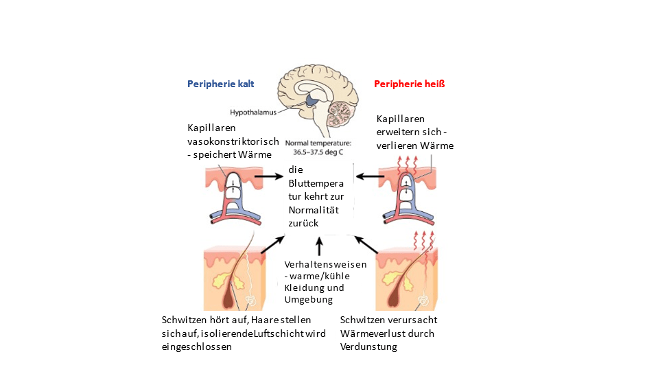 Wenn die Peripherie des Körpers heiß ist (rechte Seite der Abbildung), senden sensorische Nervenrezeptoren in der Haut Nachrichten an das Wärmeabgabezentrum im Hypothalamus. Das Wärmeverlustzentrum aktiviert das Nervensystem, um die Kapillaren nahe der Hautoberfläche zu erweitern, was zu einem Wärmeverlust führt. Das Nervensystem regt die Schweißsekretion der Schweißdrüsen an. Wenn der Schweiß auf der Haut verdunstet, wird der Haut Wärmeenergie entzogen.