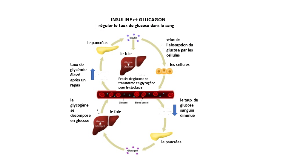 Le premier exemple de système de rétroaction négative est la régulation du taux de glucose dans le sang. Reportez-vous à la partie centrale gauche de l’illustration ci-dessous. Après avoir mangé un repas, le niveau de glucose dans le sang augmente. Le pancréas sécrète l’hormone insuline. L’insuline circule dans le sang et stimule les cellules à absorber le glucose pour l’utiliser comme énergie. Tout excès de glucose est transporté vers le foie où il est transformé en glycogène et stocké. Lorsque le taux de glucose dans le sang descend en dessous du niveau normal, le pancréas sécrète l’hormone glucagon. Le glucagon est transporté dans le sang jusqu’au foie, ce qui entraîne la décomposition du glycogène stocké en glucose. Le glucose passe dans le sang, ce qui ramène le taux de glucose dans le sang à la normale.