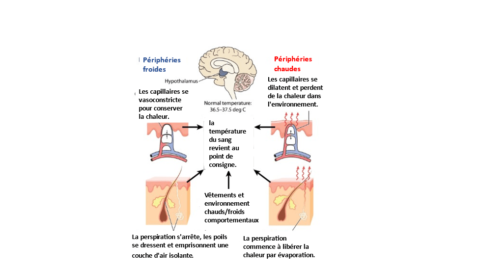 Lorsque les périphéries du corps sont chaudes (côté droit de l’illustration), les récepteurs nerveux sensoriels de la peau envoient des messages au centre de perte de chaleur situé dans l’hypothalamus. Le centre de perte de chaleur active le système nerveux pour dilater les capillaires près de la surface de la peau, ce qui entraîne une perte de chaleur. Le système nerveux active la sécrétion de sueur par les glandes sudoripares. Lorsque la sueur s’évapore de la peau, l’énergie thermique est éliminée de la peau.