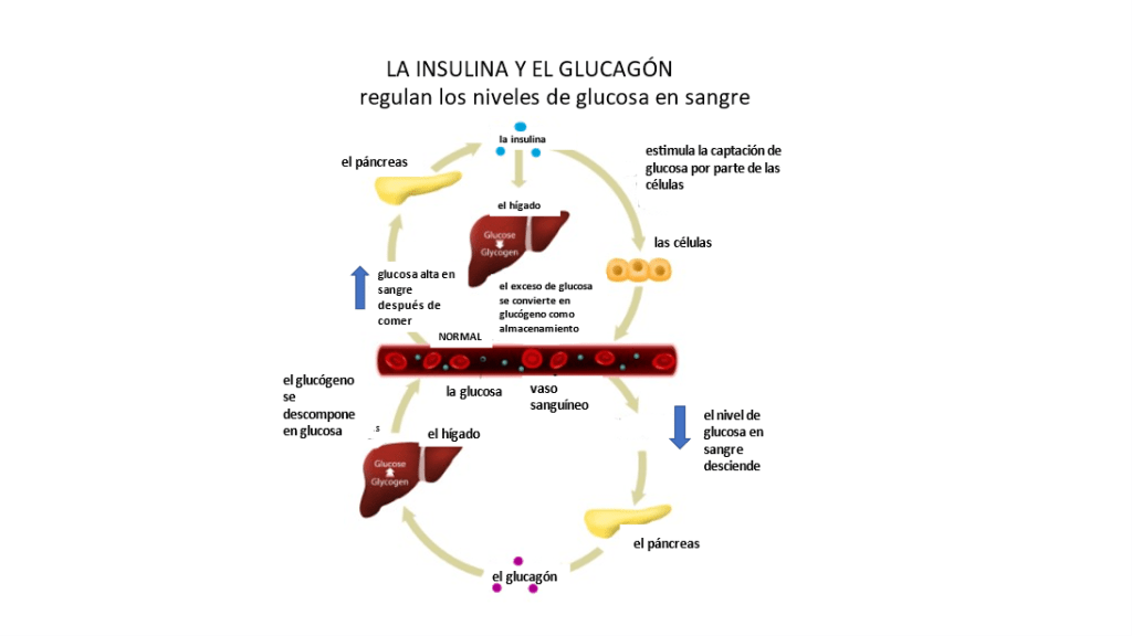 El primer ejemplo de sistema de retroalimentación negativa es la regulación de los niveles de glucosa en la sangre. Consulte la parte central izquierda de la siguiente ilustración. Después de comer, el nivel de glucosa en la sangre aumenta. El páncreas segrega la hormona insulina. La insulina viaja por la sangre estimulando a las células a captar glucosa para utilizarla como energía. El exceso de glucosa se transporta al hígado, donde se convierte en glucógeno y se almacena. Cuando los niveles de glucosa en la sangre disminuyen por debajo del nivel normal, el páncreas segrega la hormona glucagón. El glucagón es transportado por la sangre hasta el hígado, haciendo que el glucógeno almacenado se descomponga en glucosa. La glucosa entra en la sangre, con lo que el nivel de glucosa en la sangre vuelve a ser normal.