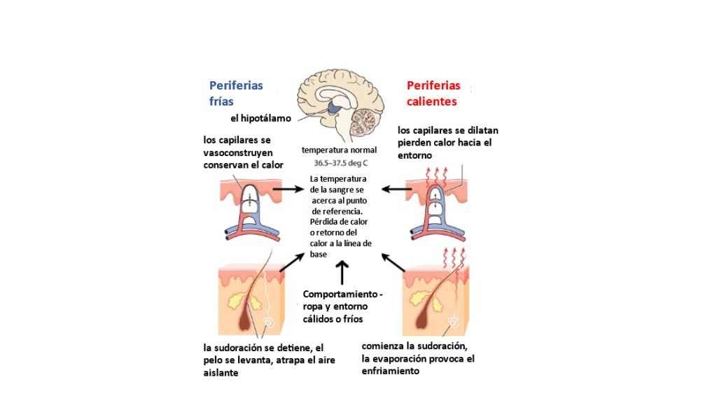 Cuando la periferia del cuerpo está caliente (parte derecha de la ilustración), los receptores nerviosos sensoriales de la piel envían mensajes al centro de pérdida de calor del hipotálamo. El centro de pérdida de calor activa el sistema nervioso para dilatar los capilares cercanos a la superficie de la piel, lo que provoca la pérdida de calor. El sistema nervioso activa la secreción de sudor de las glándulas sudoríparas. Cuando el sudor se evapora de la piel, se elimina la energía térmica de la piel.