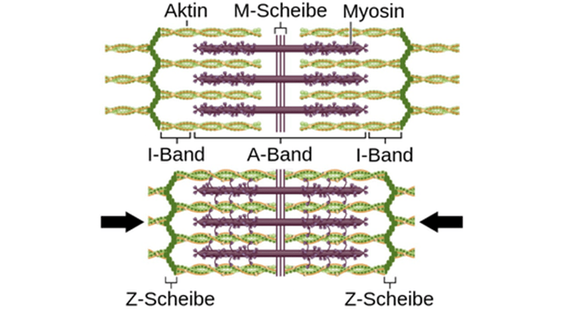 Hier ist ein weiteres visuelles Diagramm, das Ihnen helfen soll, sich vorzustellen, was in Ihren Muskeln passiert, wenn sie sich zusammenziehen oder entspannen. Schauen Sie sich noch einmal das erste Diagramm an und setzen Sie die Veränderung im Muskel mit dem Gleiten und Loslassen der Aktin-Muskelfaser über die Myosin-Faser in Beziehung. Verstehst du jetzt, was passiert, wenn du deine Muskeln dehnst? Verstehst du, warum Muskeln nach dem Tod eines Menschen an ihrem Platz verharren? Ist Ihnen schon einmal die Steifheit eines toten Tieres aufgefallen, das am Straßenrand liegt? Haben Sie schon einmal von dem Begriff “Totenstarre” gehört? Gerichtsmediziner nutzen das Wissen über die Leichenstarre, um den Zeitpunkt des Todes zu bestimmen.