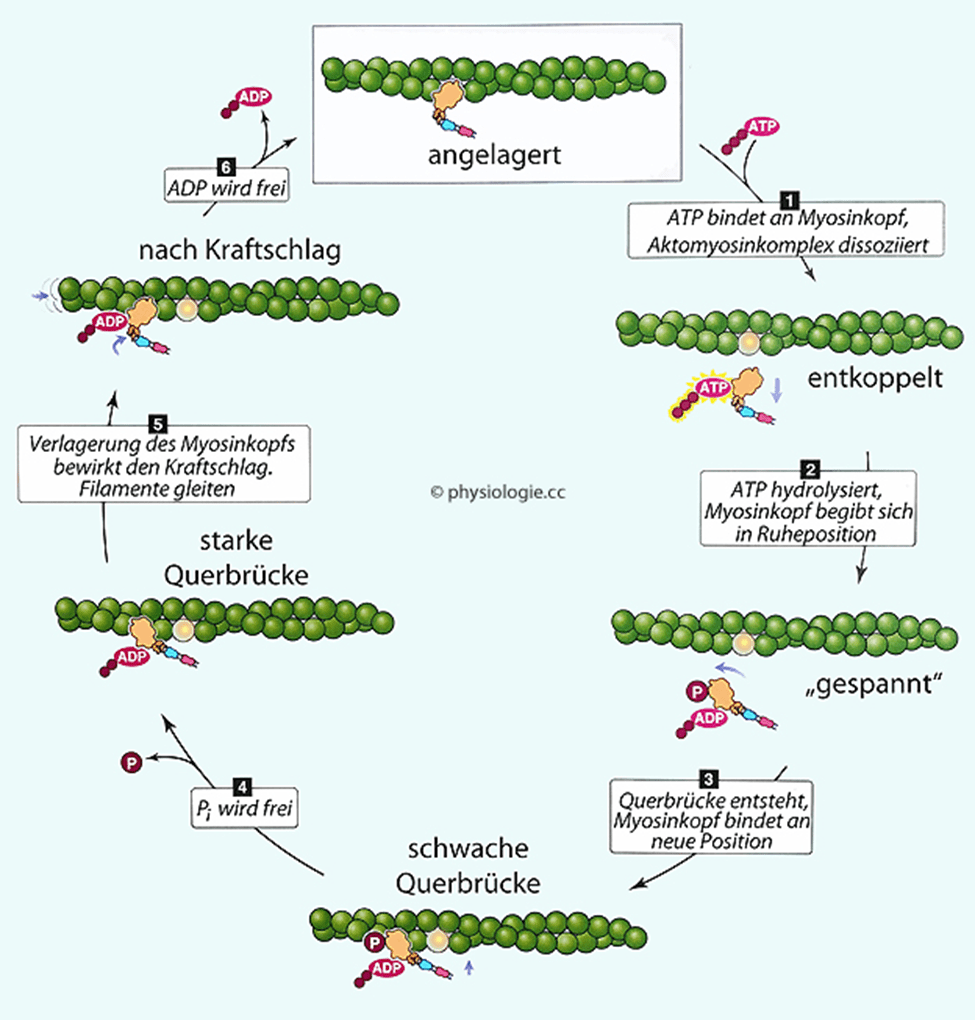 Zwei verschiedene Muskelfasern wirken zusammen, wenn ein Muskel arbeitet und dann entspannt wird. Die eine Faser, Aktin, ist dünn im Vergleich zur dicken Faser Myosin. Damit sich ein Muskel zusammenziehen kann, muss die Myosinfaser an der Aktinfaser ansetzen und sie in die Mitte ziehen. Das erfordert Energie! ATP ist die Energiewährung in Ihrem Körper. ATP entsteht als Nebenprodukt, wenn Sauerstoff in Ihre Muskelzellen gelangt. ATP treibt den Kraftschlag an, um eine Querbrücke zu bilden, die die Myosinfaser mit der Aktinfaser verbindet. Dann wird die Aktinfaser in die Mitte gezogen. Wenn die ATP-Energie aufgebraucht ist, bricht die Querbrücke und das Aktinfilament gleitet in seine ursprüngliche Position zurück. Gott hat das ATP-Energiemolekül so geschaffen, dass es leicht regeneriert werden kann. Aber ohne die Anwesenheit von Sauerstoff kann der Körper kein ATP produzieren.