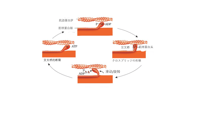 交叉桥。然后肌动蛋白纤维被拉向中间。当 ATP 能量用完时,横桥断裂,肌动蛋白丝滑