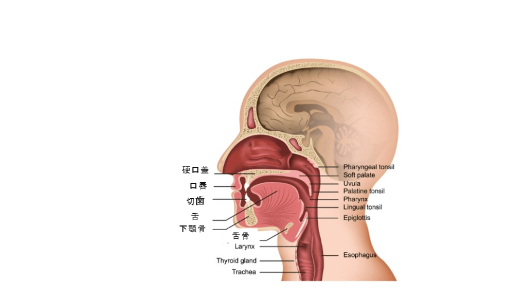 日本語の音を作る時には、口唇・舌・下あご・軟口蓋が活躍します。 口唇を使う音には「パ行」や「バ行」、「マ行」があります。舌は先を使えば「タ行」や「ナ行」、奥を使えば「カ行」など、使う場所を変えて出したい音を調節しています。軟口蓋とは上あごの奥にある柔らかい部分です。この部分の運動によって鼻から抜く音(マ行など)と抜かない音(パ行・バ行など)を出し分けています。下あごは、口唇や舌の運動と協調して、音に合わせて口の開き方を調節しています。