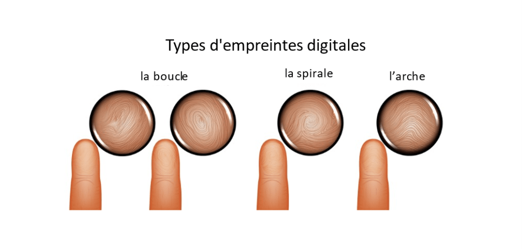 Comment les empreintes digitales permettent-elles d’identifier une personne ? Les empreintes digitales sont uniques à un individu. Une fois analysée, l’empreinte de chaque doigt est classée en fonction de sa forme. Les trois formes les plus courantes sont la boucle, la spirale et l’arche. À l’aide du tableau ci-dessous, pouvez-vous classer les deux empreintes digitales de cette photo?