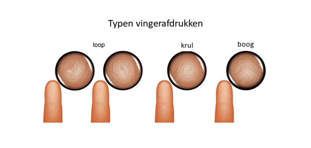 Hoe identificeren vingerafdrukken een persoon? Vingerafdrukken zijn uniek voor een persoon. Bij analyse wordt de vingerafdruk van elke vinger geclassificeerd aan de hand van de vorm. Drie veel voorkomende vormen zijn een lus, een krul en een boog. Kunt u aan de hand van de onderstaande tabel de twee vingerafdrukken op deze foto classificeren?