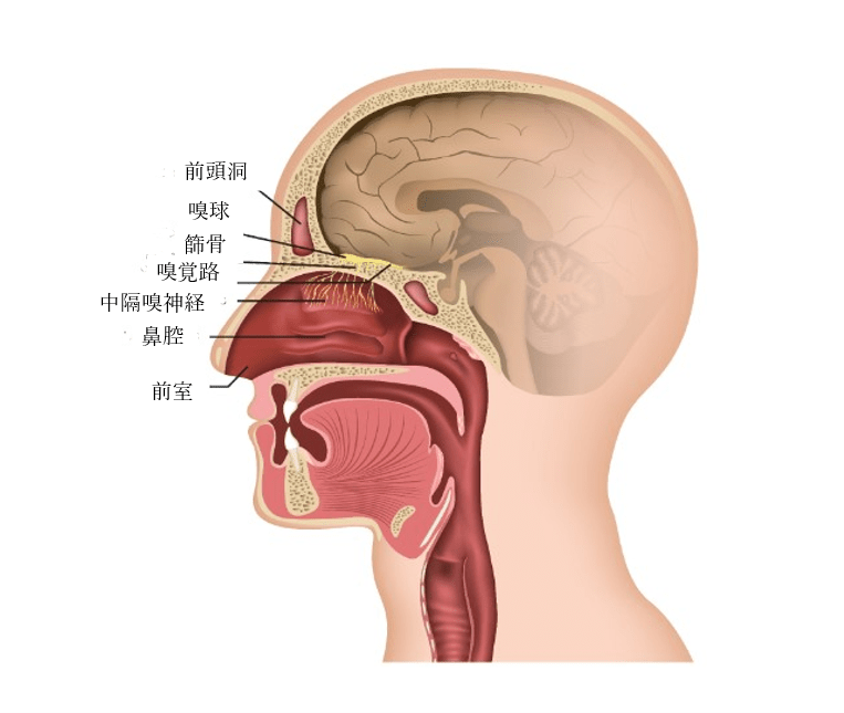 ろ過された空気は、鼻の奥上にある嗅覚ニューロンと呼ばれる特殊な神経細胞に到達します。これらの感覚ニューロンは、10種類の主要な臭気カテゴリーに分類される臭気分子を感知します。それらは:芳香性、木質/樹脂性、ミント/ペパーミント、甘い、薬品性、ポップコーン、レモン、フルーティー(柑橘系以外)、刺激性そして腐敗臭です。1,000万から2,000万個の嗅覚ニューロンは、それぞれ1つの臭気受容体を持っています。嗅覚ニューロンは、捕らえた臭いの信号を嗅覚路を通して嗅球に伝え、そこで最初の臭いの処理が行われます。嗅球は両大脳半球の下側、前頭葉の近くにあり、対になっています。