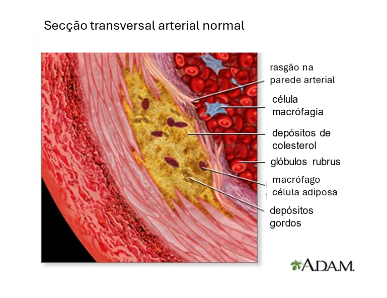 A aterosclerose é causada principalmente por uma lesão na parede arterial. Muitos fatores diferentes podem lesar a parede da artéria, desencadeando a formação de placa. Dois exemplos são o fluxo sanguíneo turbulento devido à pressão alta e anormalidades químicas do sangue, como diabetes e colesterol alto. Os sinais químicos gerados devido a uma lesão fazem com que os glóbulos brancos se fixem na parede arterial, onde coletam colesterol e outros materiais gordurosos, formando eventualmente placas. Com o tempo, o acúmulo de placa estreita o espaço dentro de uma artéria. As paredes internas da artéria tornam-se mais espessas e menos elásticas, tornando-as propensas a lesões.