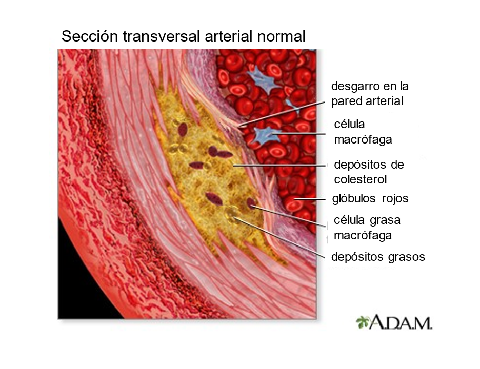 La aterosclerosis está causada principalmente por una lesión de la pared arterial. Muchos factores diferentes pueden lesionar la pared arterial y desencadenar la formación de placa. Dos ejemplos son el flujo sanguíneo turbulento debido a la hipertensión arterial y las anomalías químicas de la sangre, como la diabetes y el colesterol alto. Las señales químicas que se generan a causa de una lesión hacen que los glóbulos blancos se adhieran a la pared arterial, donde acumulan colesterol y otros materiales grasos, formando finalmente la placa. Con el tiempo, la acumulación de placa estrecha el espacio dentro de una arteria. Las paredes internas de la arteria se vuelven más gruesas y menos elásticas, lo que las hace más propensas a sufrir lesiones.