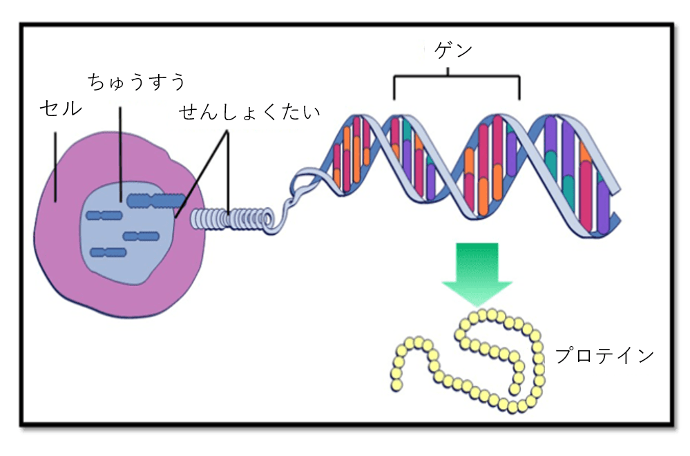 23本の染色体にはそれぞれ、遺伝子と呼ばれる特定のDNA領域がある。 遺伝子は、細胞が特定のタンパク質を生産するためのコードを持つ。 例えば、膵臓の細胞はインスリンというホルモンを産生する。 皮膚や髪の細胞は、肌や髪の色を決めるメラニンというタンパク質を生成する。細胞内でコードが発現されるためには、その遺伝子のDNAがクロマチンにほぐれる必要がある。タンパク質が産生されると、その遺伝子のクロマチンは巻きついてループ状になり、染色体上の凝縮した形に戻る。