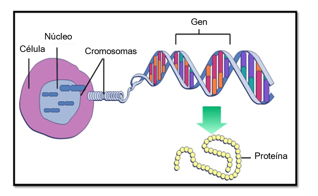 Cada uno de los 23 cromosomas tiene regiones específicas de ADN llamadas genes. Los genes codifican las células para que produzcan proteínas específicas. Por ejemplo, las células del páncreas producen la hormona insulina. Las células de la piel y el cabello producen la proteína melanina, que determina el color de la piel y el cabello. Para que el código se exprese en la célula, el ADN de ese gen tiene que desenrollarse en la cromatina. Una vez producida la proteína, la cromatina de ese gen se enrolla y vuelve a su forma condensada en el cromosoma.