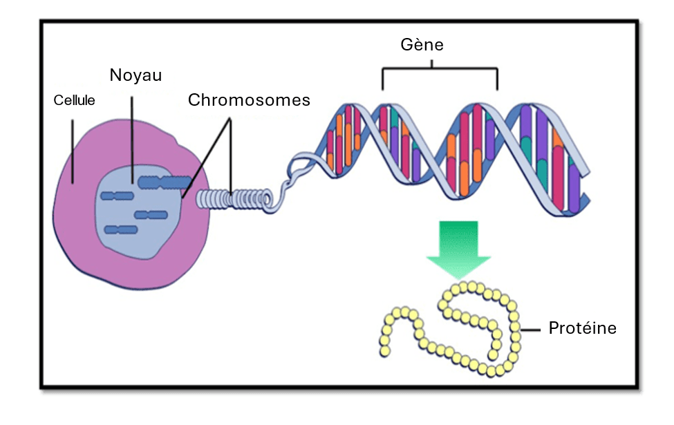 Chacun des 23 chromosomes possède des régions spécifiques d’ADN appelées gènes. Les gènes codent pour que les cellules produisent des protéines spécifiques. Par exemple, les cellules du pancréas produisent l’hormone insuline. Les cellules de la peau et des cheveux produisent la protéine mélanine qui détermine la couleur de la peau et des cheveux. Pour que le code soit exprimé dans la cellule, l’ADN du gène doit se dérouler dans la chromatine. Une fois la protéine produite, la chromatine de ce gène s’enroule et se replie dans sa forme condensée sur le chromosome.