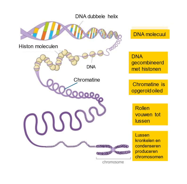 Het menselijk genoom bevat ongeveer 3 miljard basenparen DNA, verpakt in 23 chromosomen. Alle cellen in het menselijk lichaam (behalve vrouwelijke eicellen en mannelijke zaadcellen) bevatten 23 paar chromosomen. Dat zijn in totaal 6 miljard basenparen DNA per cel. Omdat elk basenpaar ongeveer 0,34 nanometer lang is, bevat elke menselijke cel ongeveer 2 meter DNA [0,34 × 10-9) × (6 ×109)]. Hoe kan al dit DNA in de celkern passen?