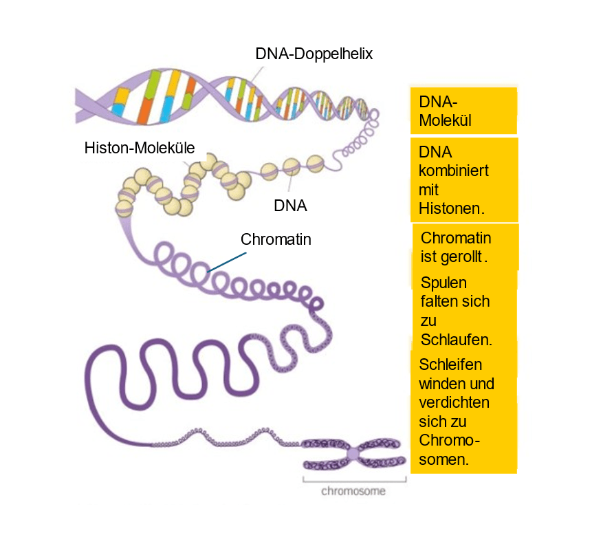 Als Gott uns schuf, stimmte er stets Struktur und Funktion aufeinander ab. Nichts war ungeplant oder chaotisch. Die Antwort auf diese Frage liegt in der Tatsache, dass die DNA Proteine namens Histone enthält. Die DNA ist um diese Proteine gewickelt wie Perlen auf einer Schnur und bildet so das Chromatin. Die Windungen des Chromatins werden zu Schleifen gefaltet, die sich zu einem Chromosom zusammenschließen.
