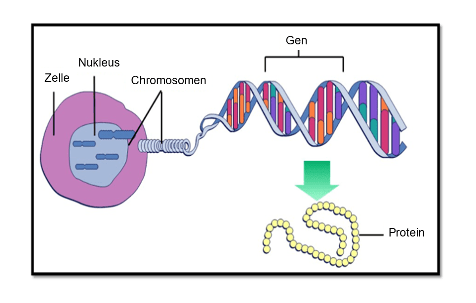 Jedes der 23 Chromosomen verfügt über bestimmte DNA-Abschnitte, die Gene genannt werden. Gene kodieren für Zellen, die bestimmte Proteine produzieren. Die Zellen in der Bauchspeicheldrüse produzieren zum Beispiel das Hormon Insulin. Die Zellen in Haut und Haar produzieren das Protein Melanin, das die Haut- und Haarfarbe bestimmt. Damit der Code in der Zelle ausgedrückt werden kann, muss sich die DNA des Gens zu Chromatin entrollen. Sobald das Protein hergestellt ist, wickelt sich das Chromatin dieses Gens wieder in seine kondensierte Form auf dem Chromosom zurück.