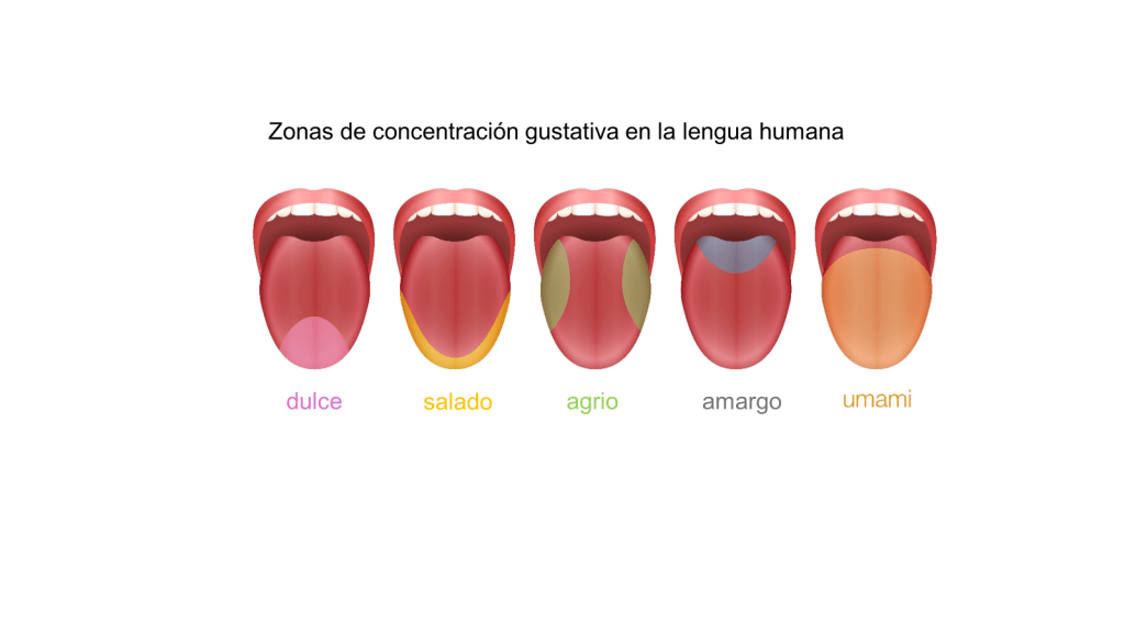 Los humanos recibimos los sabores a través de unos órganos sensoriales llamados papilas gustativas, situados en el paladar y en la garganta y concentrados en la parte superior de la lengua. Algunas zonas de la lengua son más sensibles a determinados sabores, como el amargo en la parte posterior de la lengua, el ácido a lo largo de ambos lados hacia la parte posterior, el dulce en la superficie anterior o el salado alrededor del borde anterior. Las moléculas alimentarias disueltas en la saliva se unen a los receptores de la superficie de las células gustativas situadas en las papilas gustativas. Los impulsos nerviosos generados por tres nervios craneales transmiten el mensaje gustativo al bulbo raquídeo. Los impulsos gustativos siguen viajando hasta el tálamo, que los dirige a la corteza gustativa del cerebro, donde se percibe el gusto.