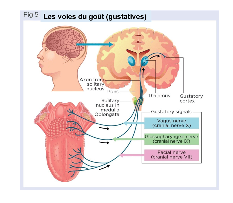 Les humains perçoivent les goûts grâce à des organes sensoriels appelés bourgeons gustatifs, situés sur le palais et dans la gorge et concentrés sur le dessus de la langue. Certaines zones de la langue sont plus sensibles à certains goûts, comme l’amer à l’arrière de la langue, l’acide de chaque côté vers l’arrière, le sucré sur la surface avant ou le salé sur le bord avant. Les molécules alimentaires dissoutes dans la salive se lient aux récepteurs à la surface des cellules gustatives situées dans les papilles gustatives. Les impulsions nerveuses générées par trois nerfs crâniens transmettent le message gustatif au bulbe rachidien. Les impulsions gustatives poursuivent leur voyage jusqu’au thalamus, qui les dirige vers le cortex gustatif du cerveau, où le goût est perçu.