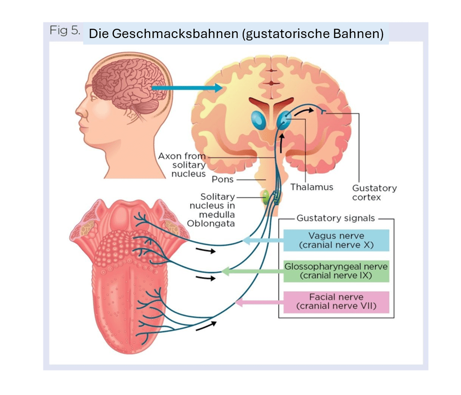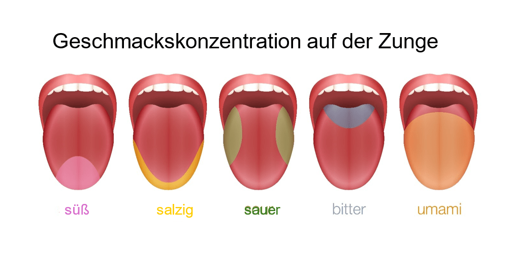 Der Mensch nimmt Geschmäcker mit Hilfe von Sinnesorganen, den so genannten Geschmacksknospen, wahr, die sich am Gaumen und im Rachen befinden und auf der Zungenspitze konzentriert sind. Bestimmte Bereiche der Zunge sind empfindlicher für bestimmte Geschmäcker, z. B. bitter am hinteren Teil der Zunge, sauer auf beiden Seiten, süß auf der Vorderseite oder salzig am vorderen Rand. Im Speichel gelöste Nahrungsmoleküle binden sich an Rezeptoren auf der Oberfläche der Geschmackszellen in den Geschmacksknospen. Nervenimpulse, die von drei Hirnnerven erzeugt werden, leiten die Geschmacksbotschaft an die Medulla oblongata weiter. Die Geschmacksimpulse wandern weiter zum Thalamus, der die Geschmacksimpulse an den gustatorischen Kortex des Gehirns weiterleitet, wo der Geschmack wahrgenommen wird.