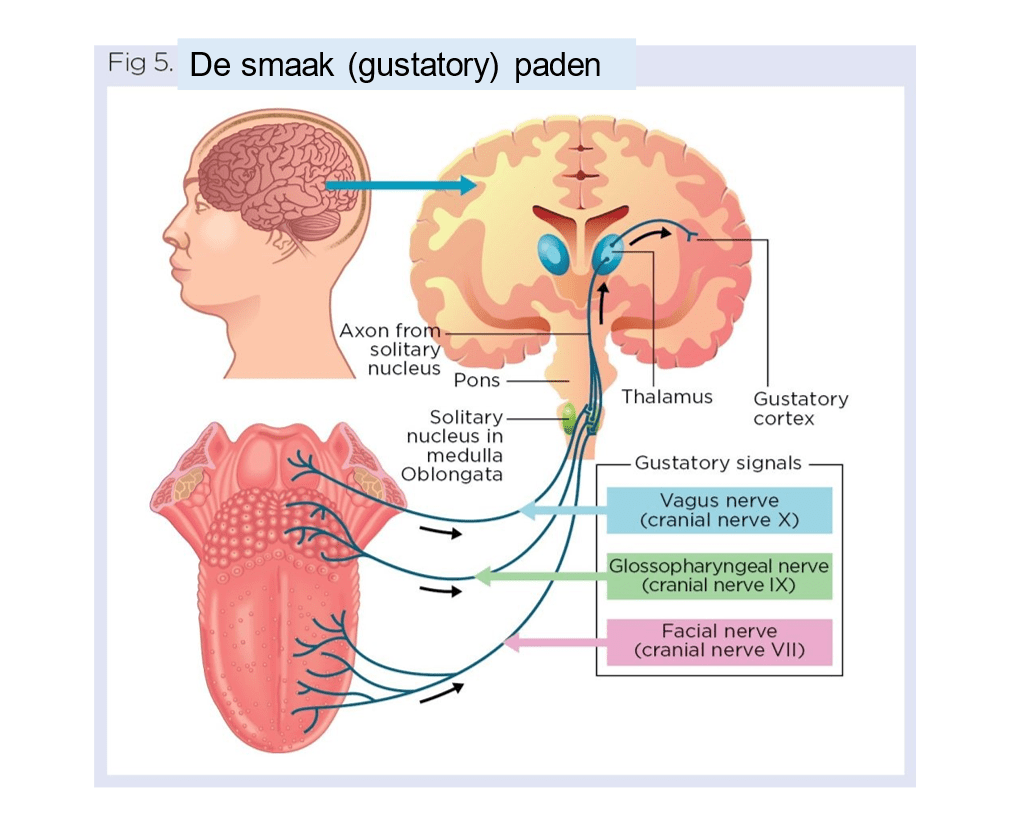 Mensen ontvangen smaken via zintuigelijke organen die smaakpapillen worden genoemd. Deze bevinden zich op het dak van de mond en in de keel en zijn geconcentreerd op de bovenkant van de tong. Bepaalde delen van de tong zijn gevoeliger voor bepaalde smaken, zoals bitter achter op de tong, zuur langs beide kanten naar achteren, zoet aan de voorkant of zout aan de voorkant. Voedselmoleculen opgelost in speeksel binden zich aan receptoren op het oppervlak van smaakcellen in de smaakpapillen. Door drie hersenzenuwen gegenereerde zenuwimpulsen geven de smaakboodschap door aan de medulla oblongata. De smaakimpulsen gaan verder naar de thalamus die de smaakimpulsen naar de smaakcortex van de hersenen stuurt waar smaak wordt waargenomen.