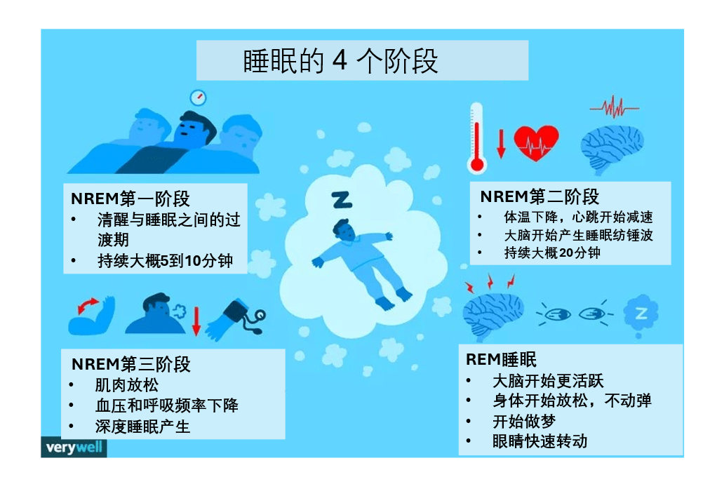 睡眠周期因年龄、压力水平、食物和饮料消耗以及药物等不同情况而异。 下图说明了人类的一般睡眠周期。