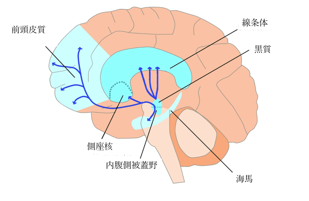 ドーパミンは側坐核の主要な神経伝達物質であり、報酬や喜びを得るのに重要な役割を果たす。側坐核は、意欲と行動の間の神経インターフェースである。