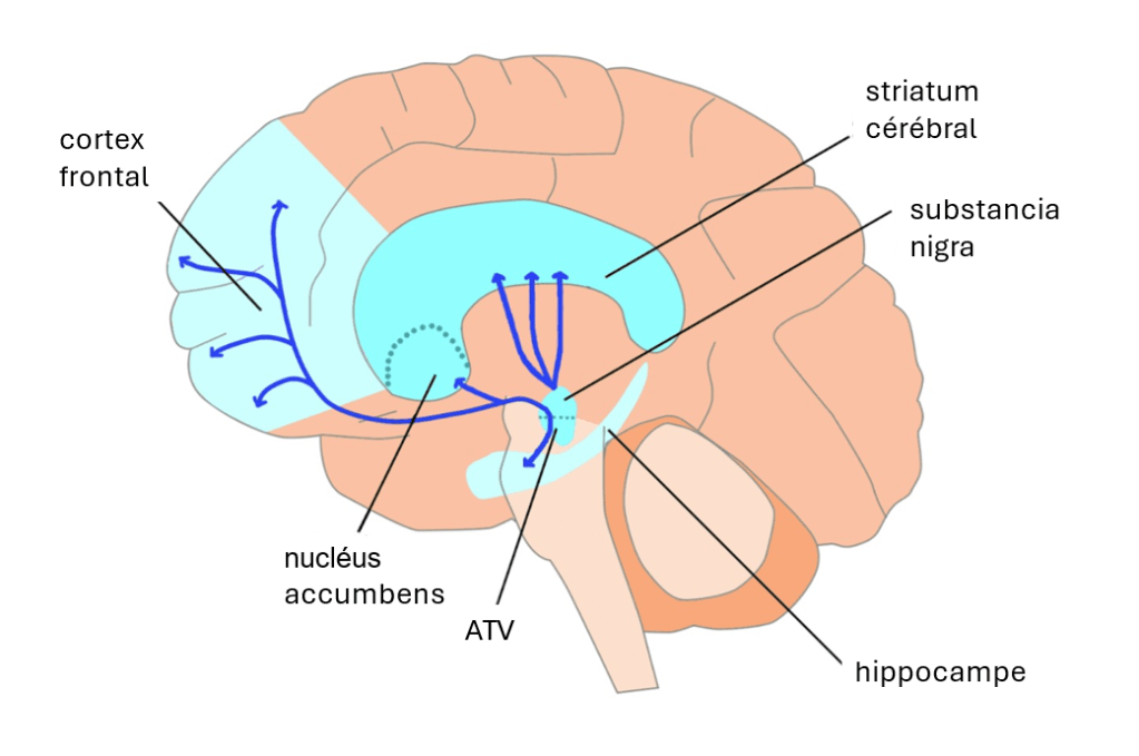 La dopamine se rend au cortex préfrontal du cerveau, qui contrôle les fonctions supérieures telles que l’attention, la motivation et la prise de décision.