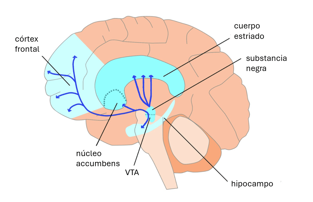 La dopamina viaja a la córtex frontal, que controla funciones superiores como prestar atención, mantenerse motivado y tomar decisiones.