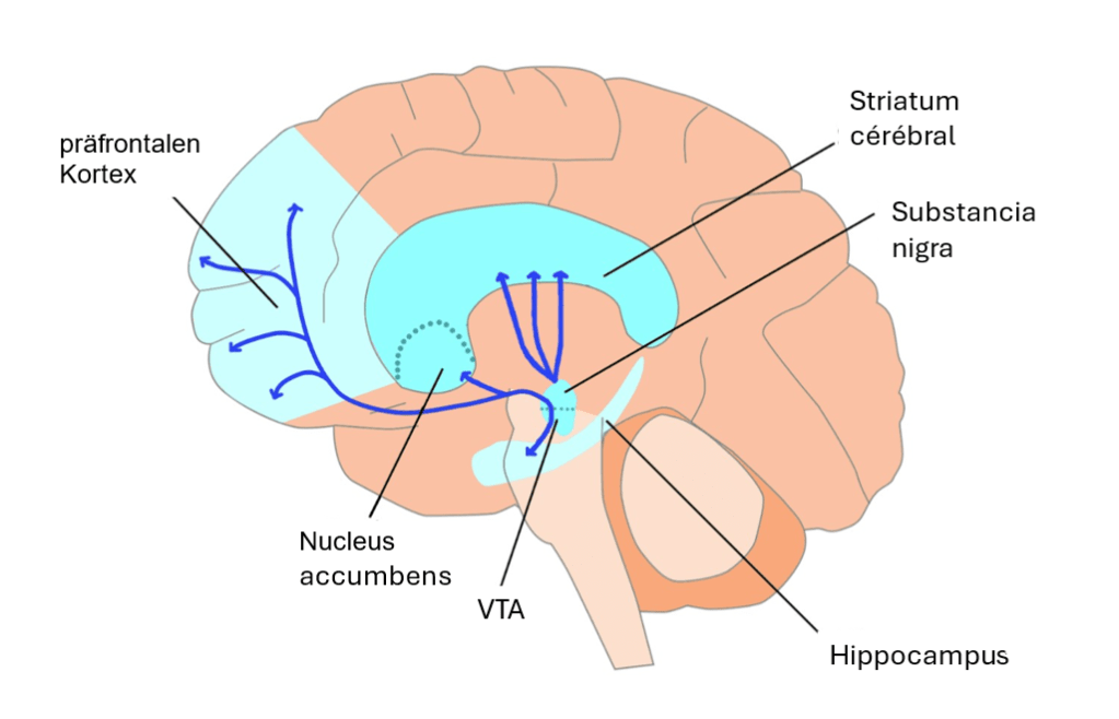 Dopamin gelangt in den präfrontalen Kortex des Gehirns, der höhere Funktionen wie Aufmerksamkeit, Motivation und Entscheidungsfindung steuert.