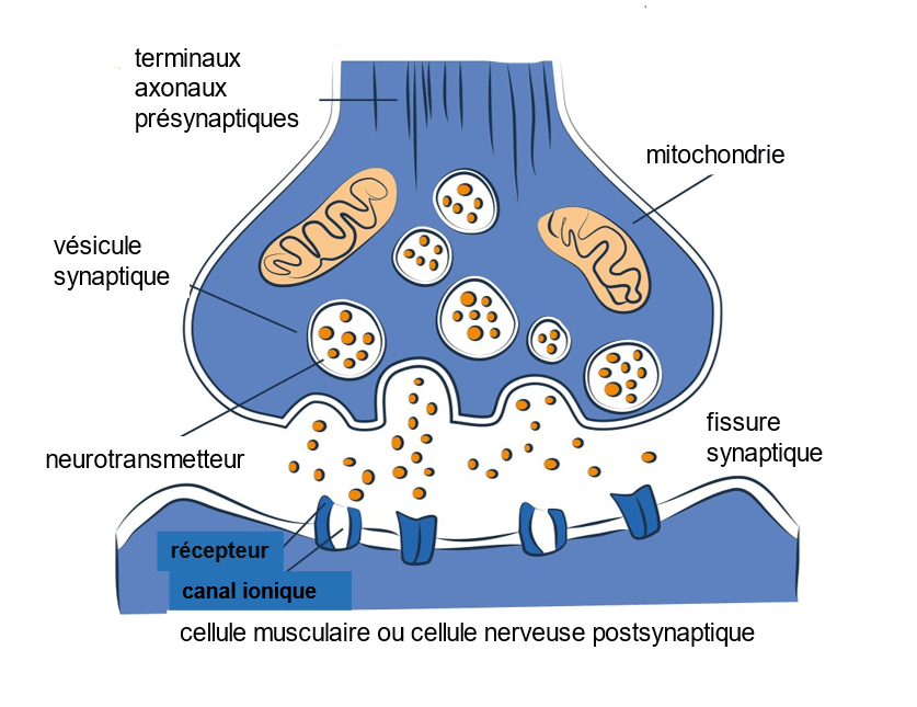 Lorsque l’influx nerveux atteint le terminal présynaptique de l’axone, le signal électrique est converti en signal chimique. Les neurotransmetteurs sont déchargés des vésicules synaptiques dans la fente synaptique, transmettant le signal à un autre neurone ou à une cellule musculaire.