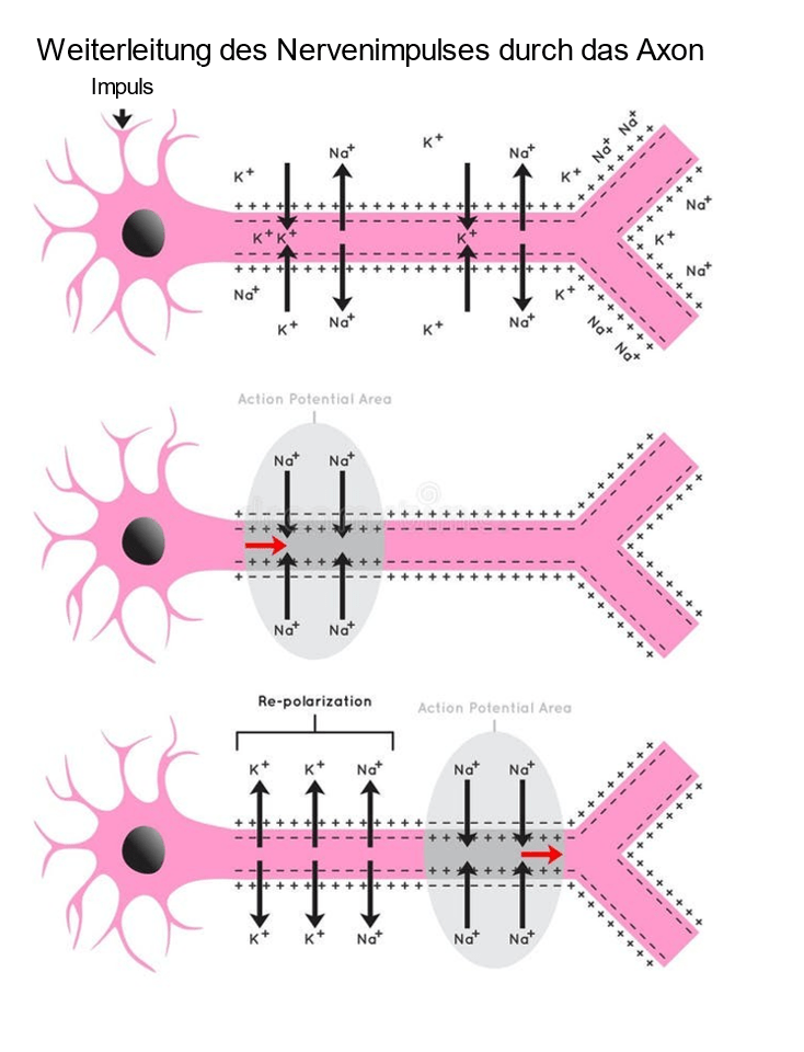 Natrium ist für die ordnungsgemäße Nerven- und Muskelsignalübertragung unerlässlich und sorgt dafür, dass diese korrekt funktionieren. Die positiv geladenen Natrium-Ionen interagieren mit positiv geladenen Kalium-Ionen. Das folgende Diagramm zeigt, wie ein Reiz durch fingerartige Fortsätze, die Dendriten, in eine Nervenzelle gelangt. Wenn die Nervenzelle in Ruhe ist, ist die Außenseite des Axons positiv und die Innenseite des Axons negativ geladen. Wenn der Nervenimpuls (roter Pfeil) in das Axon eintritt, wandern Natriumionen in das Axon, was zu einer Umkehrung der Ladungen führt. Nun ist die Außenseite des Axons negativ und die Innenseite des Axons positiv aufgeladen. Durch diese Umkehrung der Ladungen wird der Nervenimpuls auf seinem Weg durch das Axon angeregt. Hinter dem Nervenimpuls bewegen sich Kalium- und Natriumionen aus dem Axon heraus und versetzen diesen Bereich des Axons wieder in einen Ruhezustand.