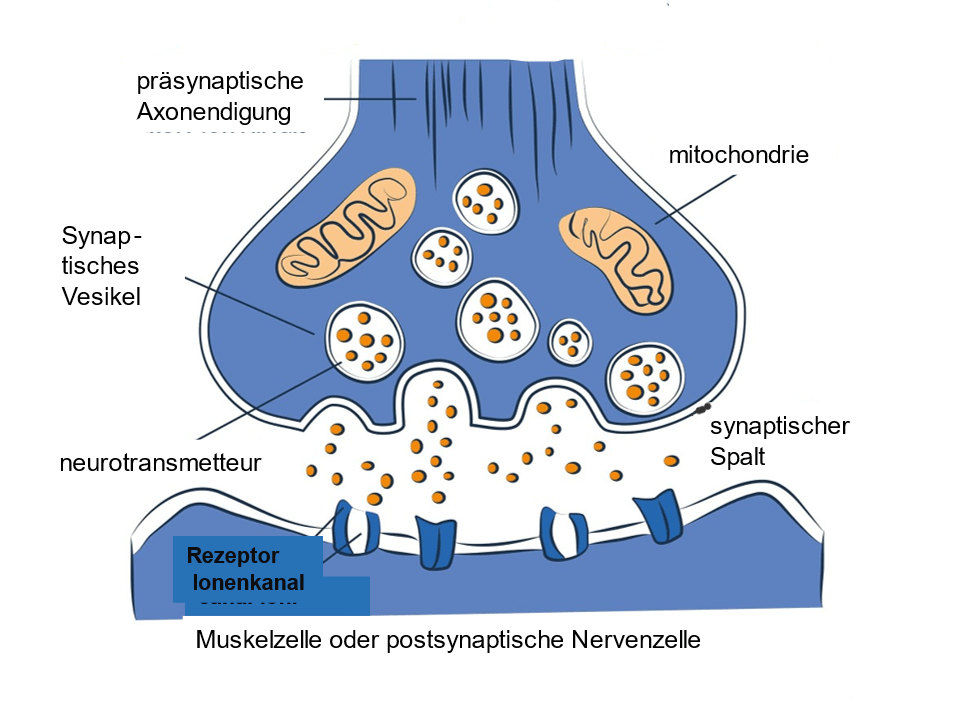 Sobald der Nervenimpuls das präsynaptische Axonende erreicht, wird das elektrische Signal in ein chemisches Signal umgewandelt. Aus den synaptischen Vesikeln werden Neurotransmitter in den synaptischen Spalt ausgeschüttet, die das Signal an ein anderes Neuron oder eine Muskelzelle weiterleiten.