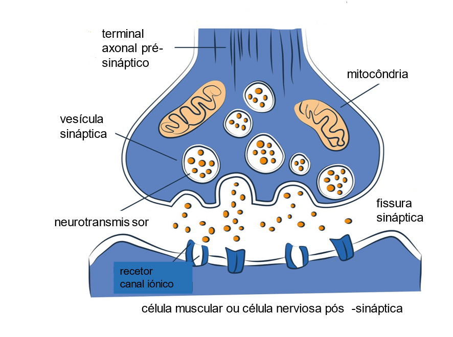 Uma vez que o impulso do nervo atinge o terminal do axônio pré-sináptico, o sinal elétrico é convertido em um sinal químico. Os neurotransmissores são descarregados de vesículas sinápticas para a fenda sináptica, transmitindo o sinal para outro neurônio ou uma célula muscular.