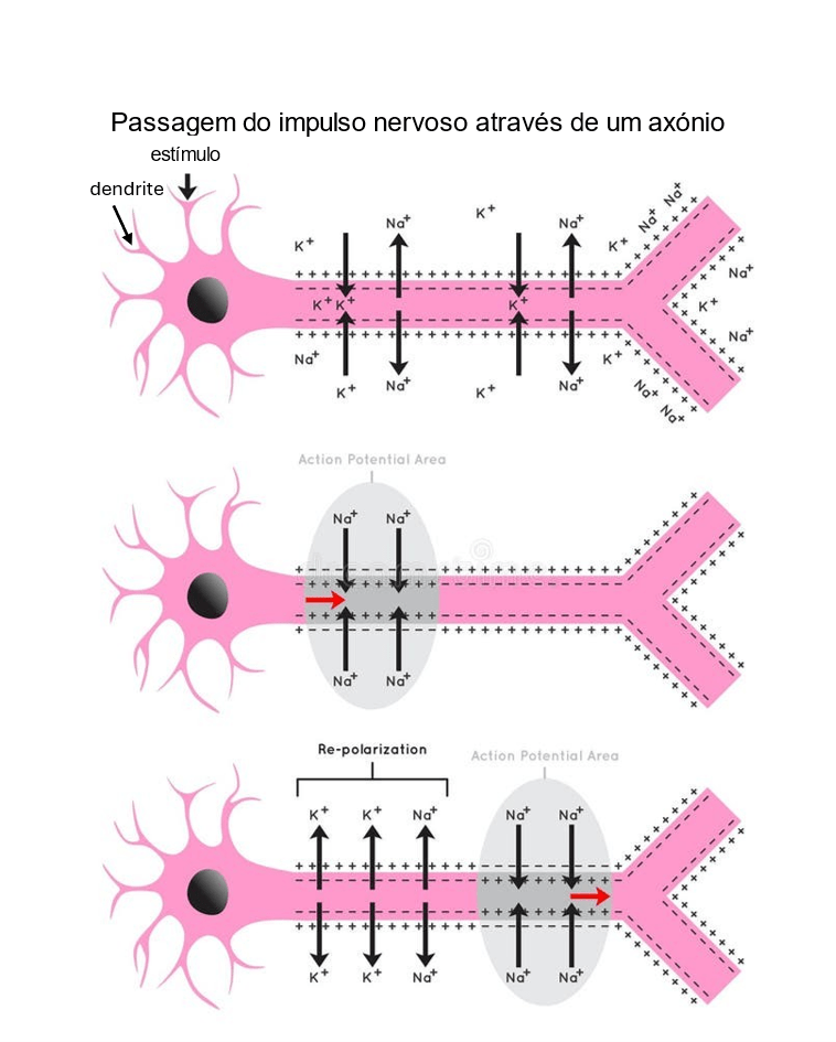 O sódio é essencial para a sinalização adequada do nervo e do músculo, garantindo que eles funcionem corretamente. Os íons de sódio carregados positivamente interagem com íons de potássio carregados positivamente. O diagrama abaixo ilustra como um estímulo entra em uma célula nervosa através de projeções semelhantes a dedos chamadas dendritos. Quando a célula nervosa está em repouso, o exterior do axônio é carregado positivamente e o interior do axônio é carregado negativamente. À medida que o impulso do nervo (seta vermelha) entra no axônio, os íons de sódio se movem para o axônio, resultando em uma reversão de cargas. Agora, o exterior do axônio é carregado negativamente e o interior do axônio é carregado positivamente. Essa reversão nas cargas energiza o impulso nervoso à medida que viaja pelo axônio. Por trás do impulso nervoso, os íons de potássio e os íons de sódio saem do axônio, retornando a região do axônio para um estado de repouso.