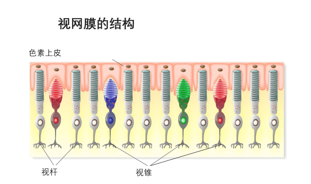 锥体有三种类型:红色(长波长-低能量)、绿色(中波长和能量)和蓝色(短波长、高能量)。 如果进入眼睛的反射光的来源是蓝色沙发,那么对蓝光做出反应的视锥细胞就会向大脑的视觉皮层发送信号。红色和绿色视锥细胞不会发送信号,因此大脑会将颜色解释为蓝色。人类看到的所有颜色都是大脑从三种类型的视锥细胞接收信号并将这三种颜色(红色、绿色和蓝色)与每种类型的视锥细胞接收到的信号量的浓度相加的结果。例如,当大脑接收到来自红色视锥细胞和蓝色视锥细胞的信号组合时,大脑就会解释紫色。