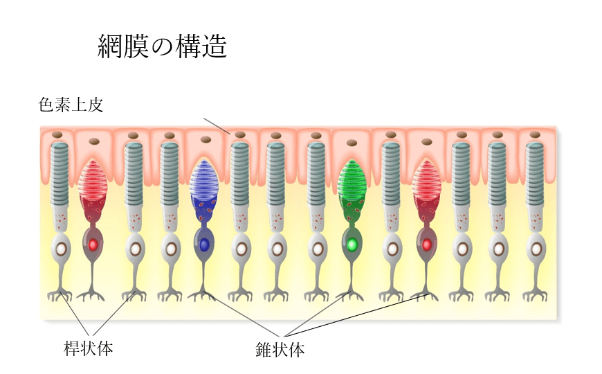 錐状体には、赤錐体(長波長・低エネルギー)、緑錐体(中波長・高エネルギー)、青錐体(短波長・高エネルギー)の3種類がある。 目に入る反射光の光源が青いソファだった場合、青い光に反応する錐体は脳の視覚野に信号を送る。 赤と緑の錐体は信号を送らないので、脳はその色を青と認識する。 人間が見ている色はすべて、脳が3種類の錐体細胞から信号を受け取り、その3色(赤、緑、青)を、それぞれの種類の錐体細胞が受け取った信号の量の濃度で足し合わせた結果である。 例えば、紫という色は、脳が赤錐体と青錐体の両方からの信号の組み合わせを受け取ったときに認識される。